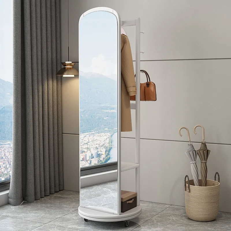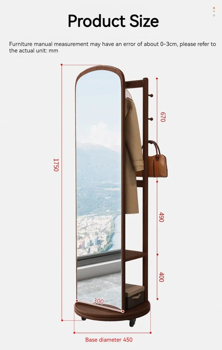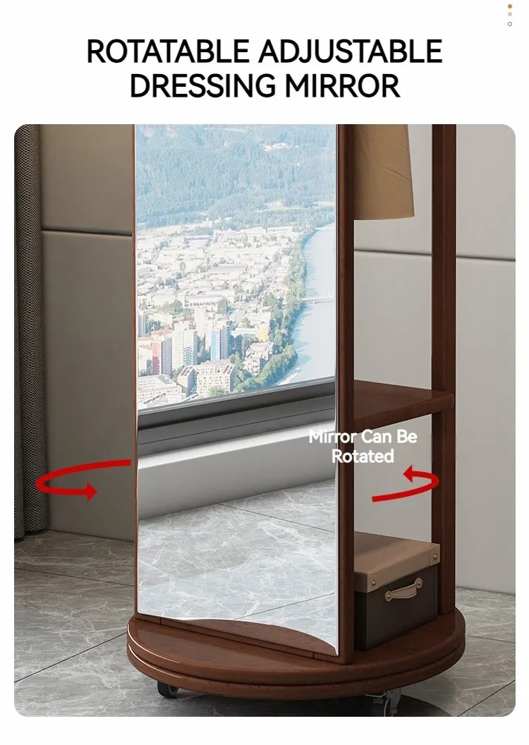 Crafted from high-quality MDF wood, this mirror features a smooth, durable finish that complements any decor style, from modern to classic. The 360° rotating design lets you switch between a full-length mirror and a handy coat rack effortlessly. It comes with multiple hooks for hanging coats, bags, hats, and scarves, plus built-in shelves to store shoes, boxes, or accessories. Equipped with smooth-rolling wheels, it’s easy to move around your space. The mirror itself offers clear, distortion-free reflection, perfect for outfit checks. Whether you need a last-minute look before heading out or a tidy spot to organize your daily wear, this piece delivers on both style and utility.