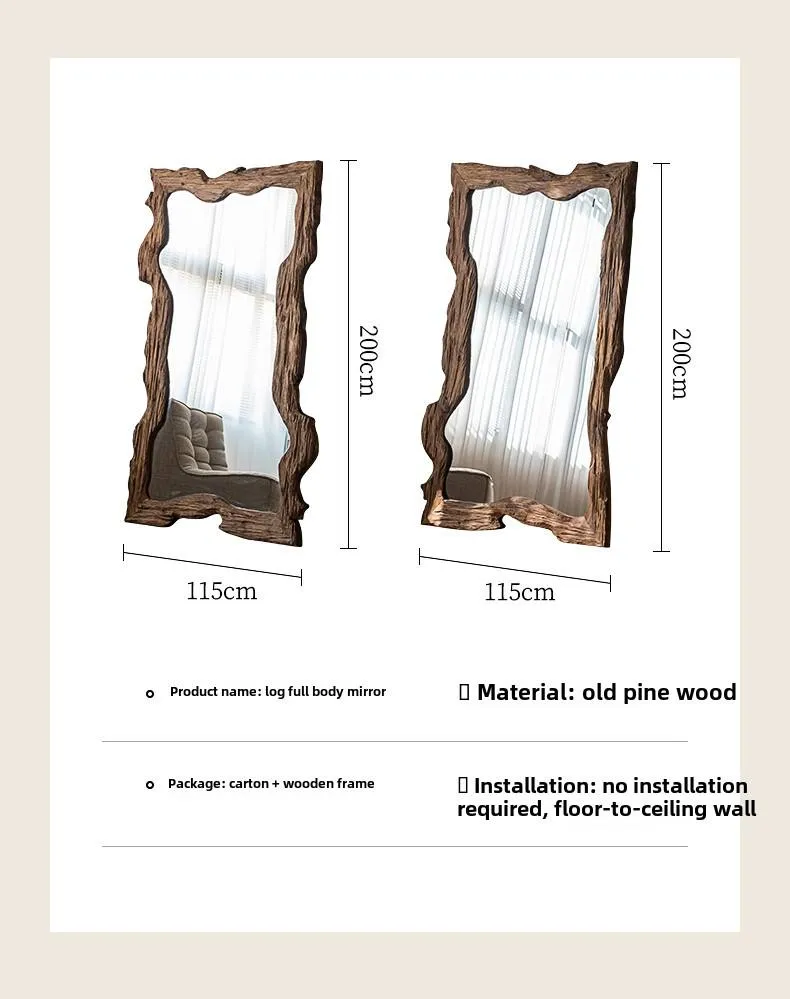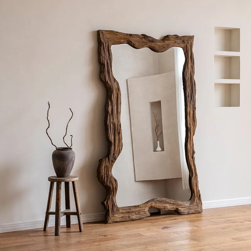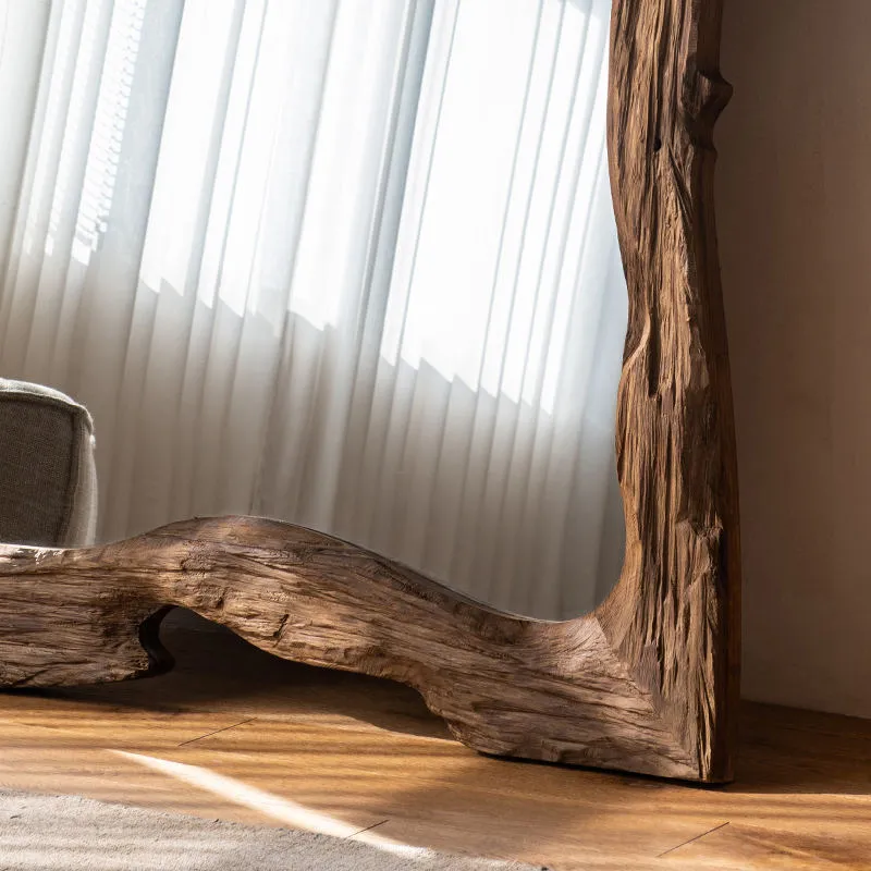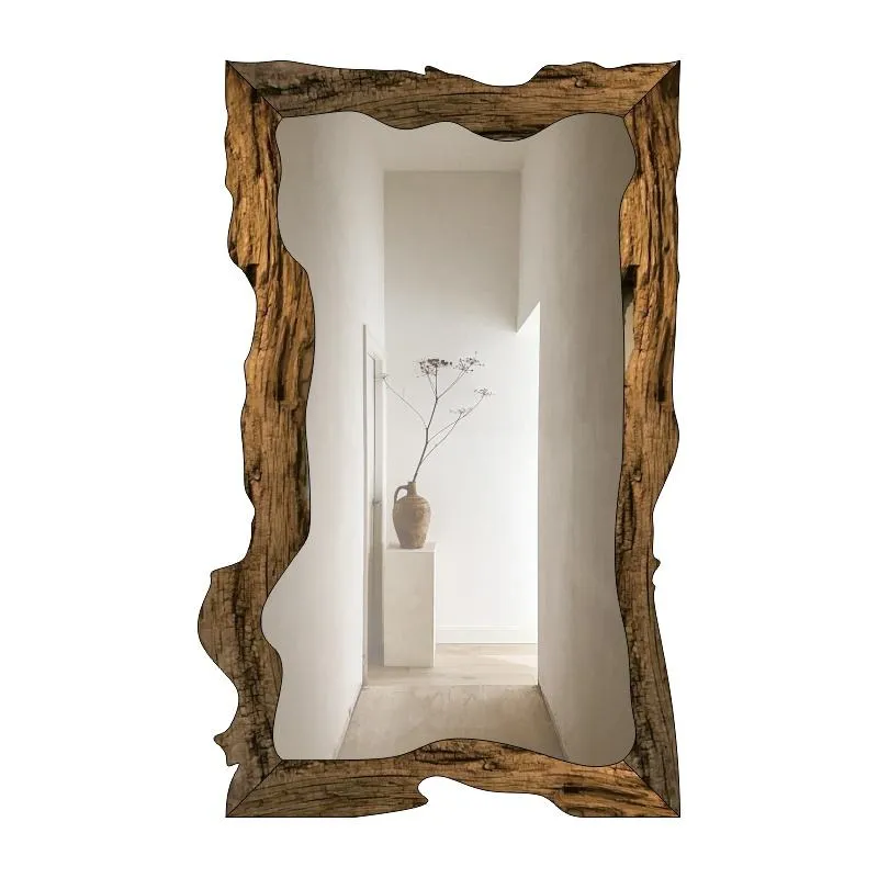 Embrace nature-inspired decor with this full-length mirror, featuring a frame crafted from naturally textured wood with organic, irregular edges. The raw, rustic design infuses spaces (bedrooms, living areas) with earthy, bohemian warmth, complementing minimalist, farmhouse, or eclectic styles. Its generous size delivers unobstructed full-body reflections for daily styling, while the unique, handcrafted frame turns it into a statement art piece. Sturdy and visually striking, this mirror merges functional utility with organic aesthetics—ideal for adding character and depth to any room.