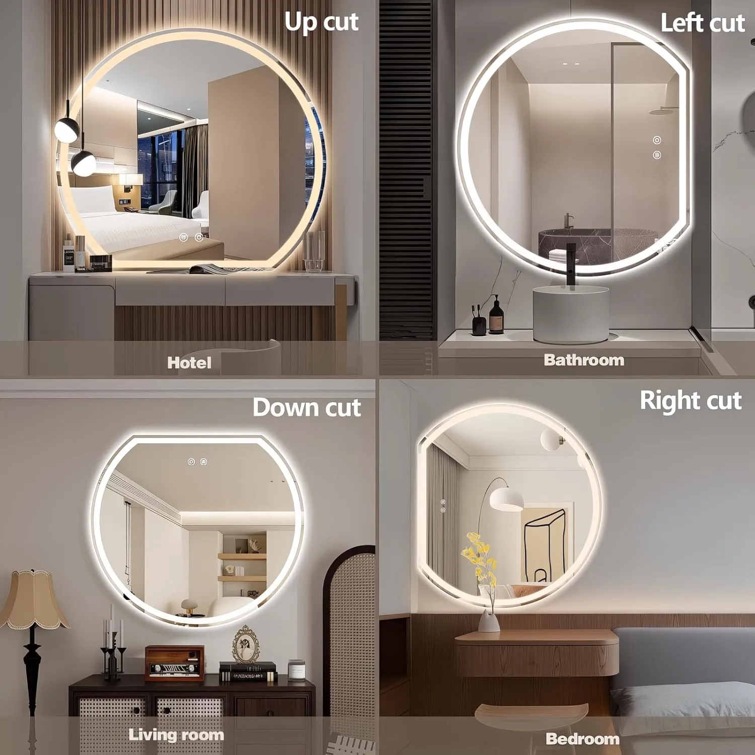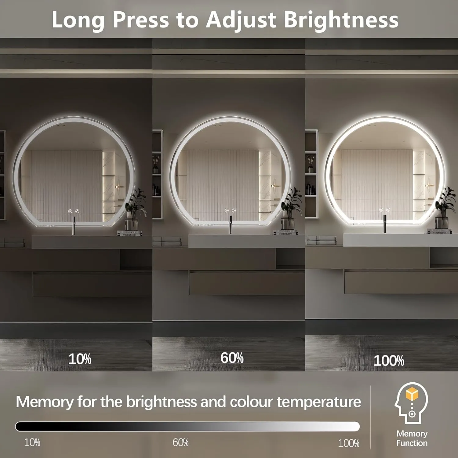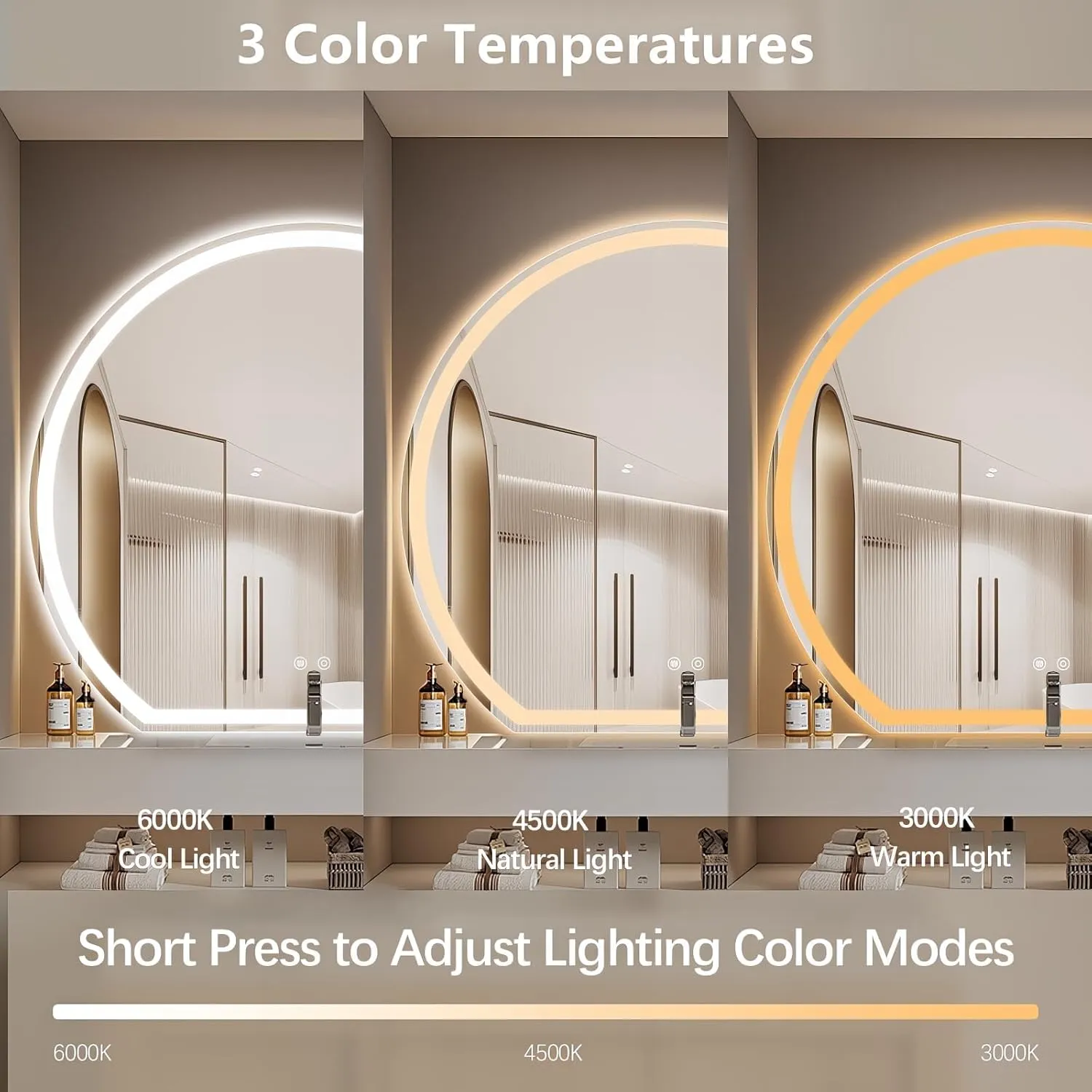 Introducing our premium LED mirror, a perfect blend of functionality and style, designed to elevate spaces like bathrooms, hotels,bedrooms, and living rooms. This mirror features 3 adjustable color temperatures (6000K Cool Light, 4500K Natural Light, 3000K Warm Light), allowing you to switch lighting modes with a simple short press to suit different moods and tasks.